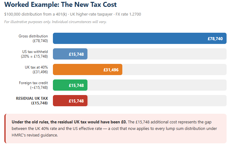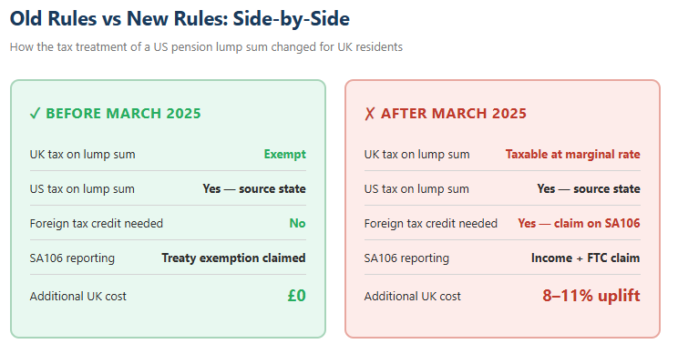 Under the previous regime, a lump sum distribution from a US pension was taxed only in the US. The individual might pay federal (and potentially state) income tax on the distribution but would face no additional UK liability. Under the new interpretation, the UK also asserts the right to tax the distribution at the individual’s marginal rate, subject to a foreign tax credit for US taxes paid.