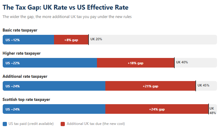 However, foreign tax credits do not always provide full relief. If the US effective tax rate on the distribution is lower than the UK marginal rate — which is commonly the case for distributions falling within lower US brackets or benefiting from US-specific reliefs — the individual will face a residual UK tax liability. Some industry estimates suggest an additional global tax cost of around 8% to 11% for affected individuals, depending on their circumstances and tax bands. For a higher-rate UK taxpayer receiving a substantial lump sum, this additional cost could be significant.