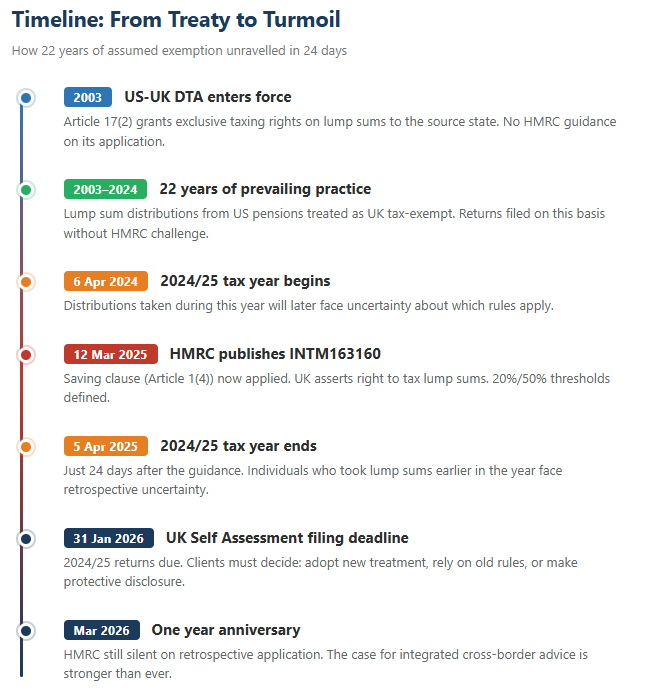 One of the most uncomfortable aspects of the March 2025 guidance was its timing. The UK tax year 2024/25 ran from 6 April 2024 to 5 April 2025. HMRC published the updated INTM163160 guidance on 12 March 2025 — just twenty-four days before the end of that tax year. For anyone who had taken a lump sum distribution from a US pension at any point during 2024/25, the question was immediate and unsettling: does this new interpretation apply to the tax year that is almost over?