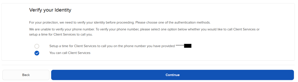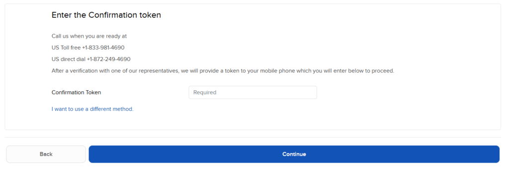 To complete your security check, please call Client Services directly using either the US Toll-free number (+1-833-981-4690) or the direct dial line (+1-872-249-4690). Please do not use the “Setup a time for Client Services to call you” button, as that specific feature is currently non-functional. Once a representative has verified your identity over the phone, they will send a unique confirmation token to your mobile device; simply enter that token into the field on the webpage and follow the remaining prompts to finalise your access.