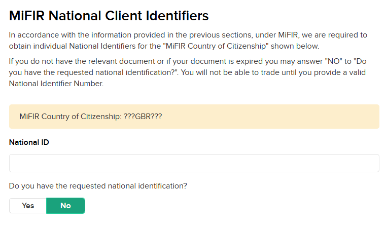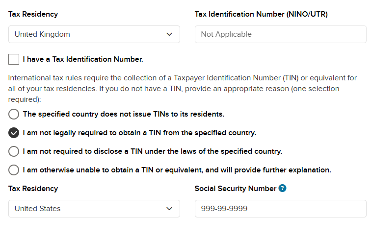- Add tax residency with suitable Tax Identification Numbers like National Insurance number for the UK and Social Security number for the USA